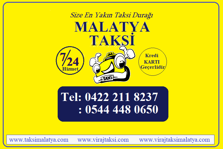 Malatya Merkez ve Malatya’nın Her yerinde 7 gün 24 saat kesintisiz, hızlı, güvenli ve ekonomik şehir içi ve şehirler arası taksi hizmeti sunuyoruz. Malatya’nın farklı bölgelerinde konumlanan ve Kredi kartı geçen taksilerle size en yakın taksi durağı olmayı hedefliyoruz. Geniş, konforlu, bakımlı, tüm hijyen tedbirleri alınmış araçlarımız ve tecrübeli şöförlerimizle Malatya’da Taksi hizmetini sizlere en iyi şekilde sunuyoruz. 7/24 Taksi ihtiyaçlarınız için size bir telefon kadar yakınız.